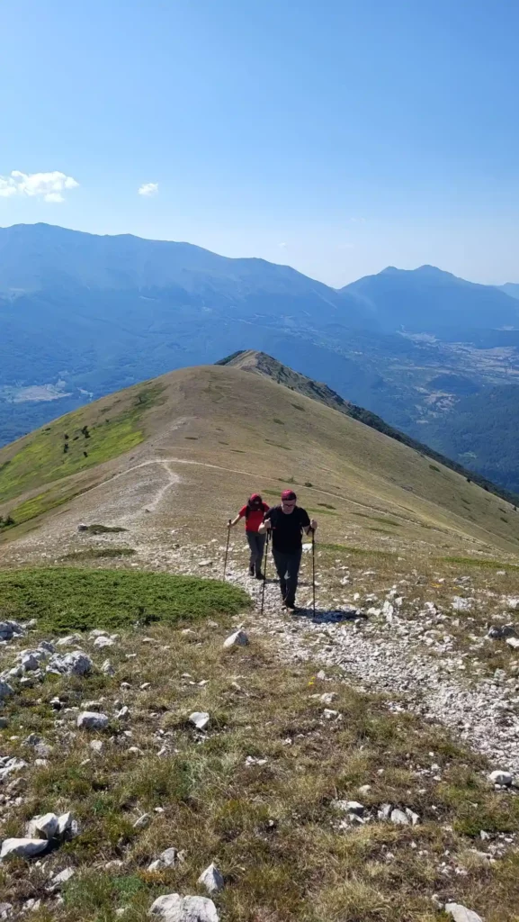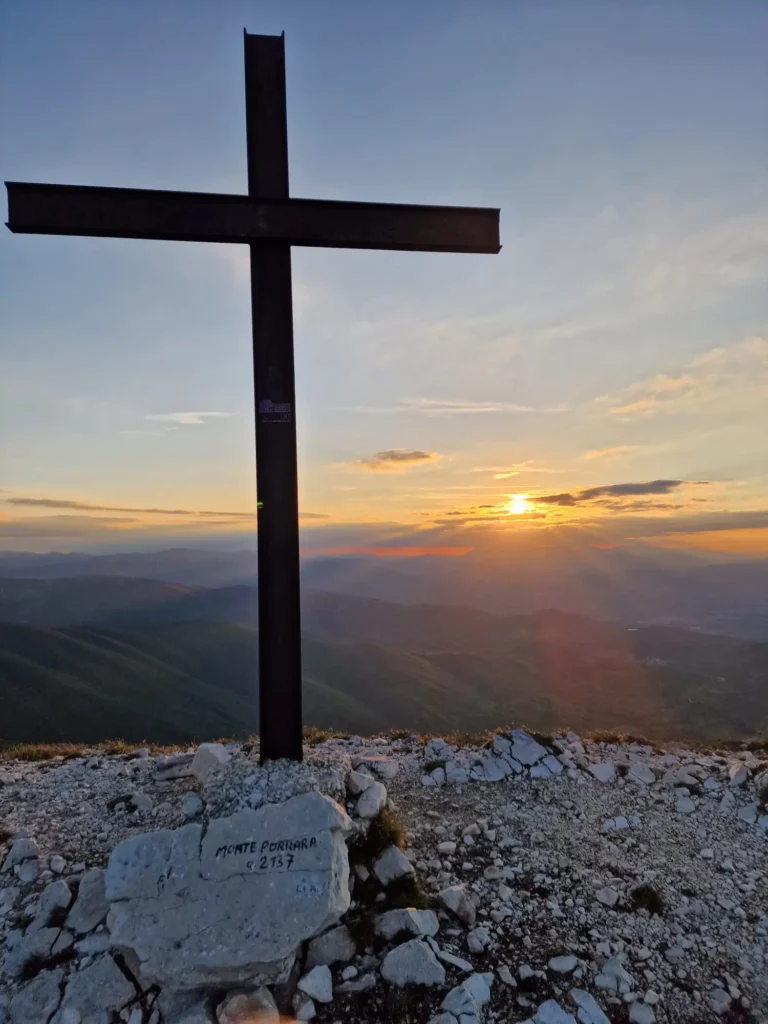 La vetta del Monte Porrara regala un momento di pura bellezza: lo sguardo abbraccia valli, montagne e l’infinito orizzonte che si perde verso l’Adriatico.